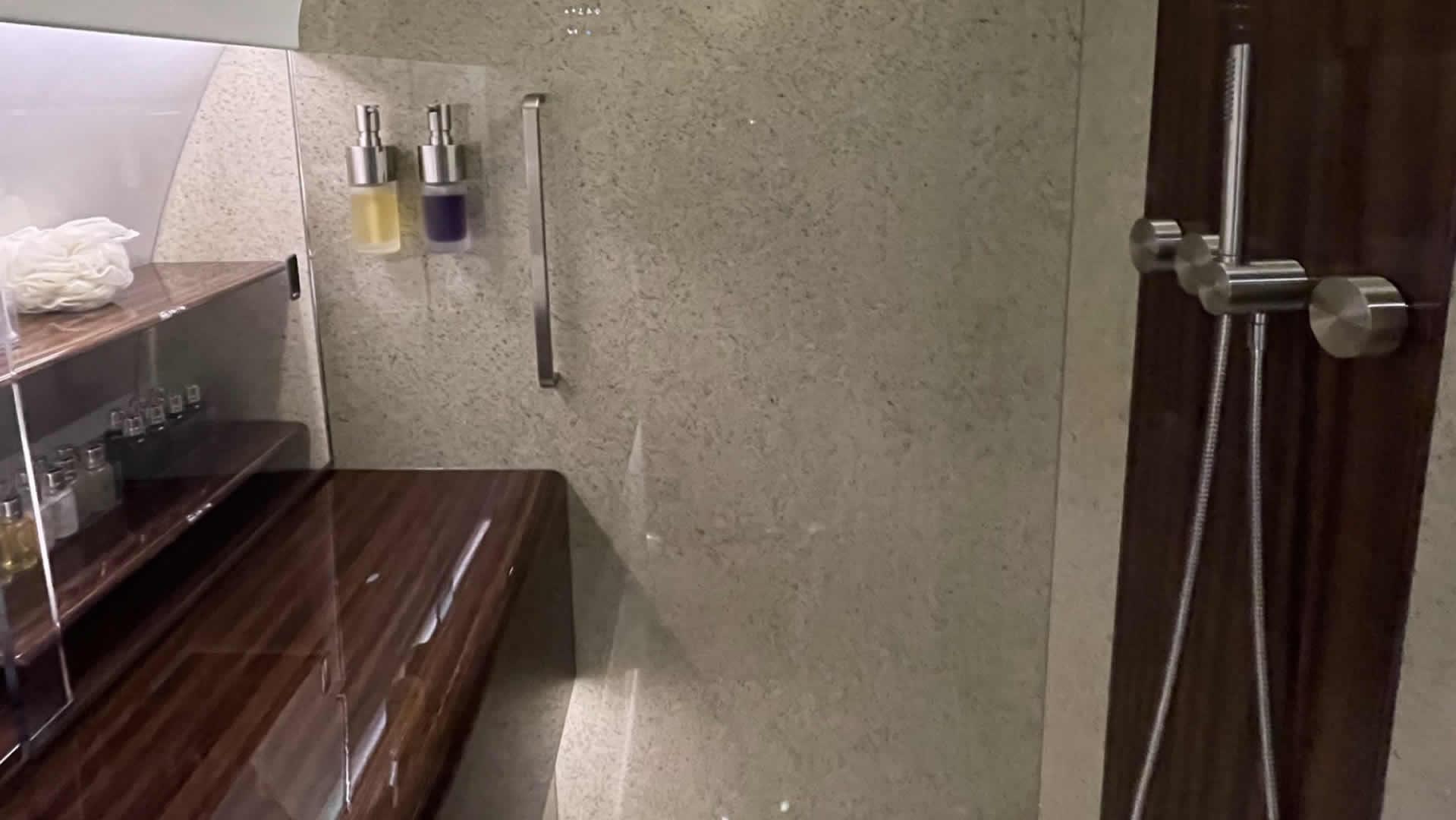 The Lineage is typically divided into 5 separate areas, which could include a bar, master suite, dining room, office, and VIP bathroom with a walk-in shower. The aircraft seats up to 19 passengers.